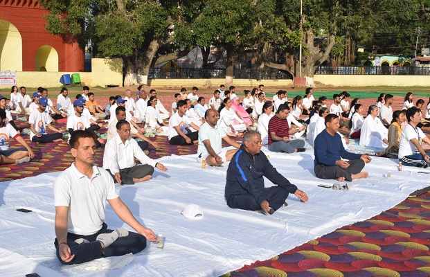 8वें अन्तराष्ट्रीय योग दिवस पर नाहन में सैकड़ों लोगों ने किया सामूहिक योग अभ्यास