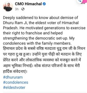 सिरमौर जिला में लोकसभा चुनाव के स्वीप कार्यक्रम में प्रमुख आईकन की भूमिका निभाने वाले 108 वर्षीय पंडित धुडू राम का निधन बीते सोमवार देर शाम को उनके गाँव बनौर में हुआ। जिला सिरमौर के पांवटा निर्वाचन क्षेत्र के गांव बनौर निवासी 108 वर्षीय पंडित धूड़ू राम शर्मा प्रदेश के सबसे ज्यादा उम्र के मतदाता थे। उनके निधन पर जिला निर्वाचन अधिकारी व् डीसी सिरमौर रामकुमार गौतम ने शौक व्यक्त किया वहीँ प्रदेश के मुख्यमंत्री सुखविंदर सुखू ने सीएमओ हिमाचल के ऑफिसल पेज व् ट्यूटर हेंडल पर उनके निधन पर शौक जताया।
