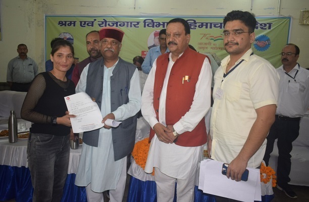 रोजगार मेले में ऊर्जा मंत्री ने पायनियर ग्रुप द्वारा चयनित जिला सिरमौर के दो युवाओं जिनमें ग्राम पंचायत अंधेरी की रितिका चैहान व ग्राम पंचायत जामना के मुकेश चैहान को सौंपे नियुक्ति पत्र