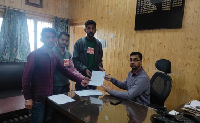 भारत की जनवादी नौजवान सभा (डीवाईएफआई) राज्य कमेटी के आव्हान पर शिमला शहरी इकाई द्वारा एसडीएम शहरी भानू गुप्ता के माध्यम से मुख्यमंत्री सुखविंदर सिंह सुक्खू को ज्ञापन सौंपा।