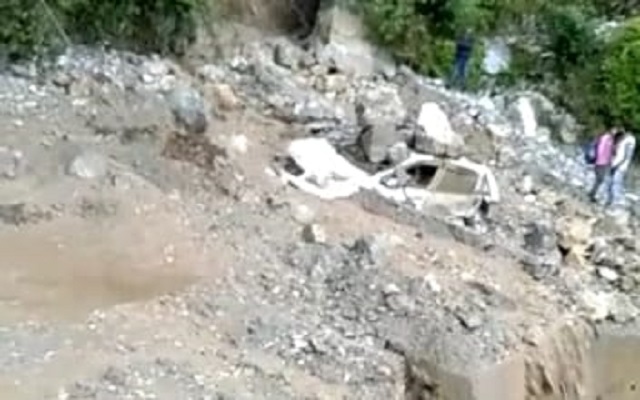 संगड़ाह के समीप एक खड़ में भारी बारिश से भूस्खलन की चपेट में आई कार