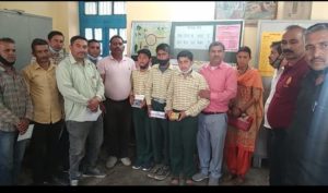 राष्ट्रीय शिक्षा नीति 2020 पर आयोजित पेंटिंग प्रतियोगिता के विजेताओं मोहित कक्षा नवम प्रथम तथा आयुष कक्षा नवम द्वितीय तथा कार्तिक कक्षा अष्टम तृतीय को अध्यक्ष सुशील शर्मा द्वारा पुरस्कृत किया गया।