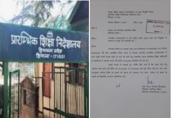 हिमाचल प्रदेश प्रारंभिक शिक्षा विभाग में पार्ट टाइम मल्टी टास्क वर्कर की नियुक्तियां की जा रही हैं। जिसके लिए आवेदन करने कि अंतिम तिथि 27 अप्रेल कि गयी थी। मंगलवार को प्रारंभिक शिक्षा निदेशालय द्वारा आवेदन करने की तिथि को 27 अप्रैल से बढ़ाकर 7 मई 2022 करने सभी उप निदेशकों को निर्देश जारी कर दिए हैं।