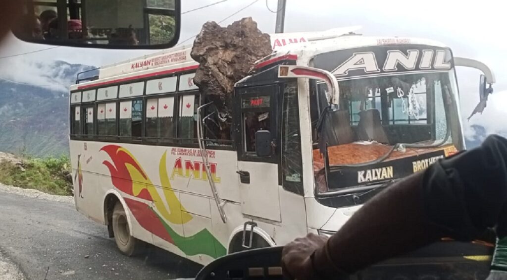 बस पर चट्टान गिरने से बाल बाल बची सवारियां, चालक और एक महिला को आई हल्की चोट