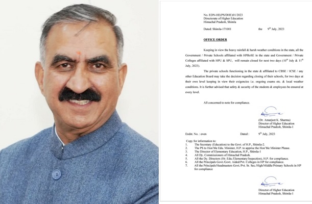 ठाकुर सुखविंदर सिंह सुक्खू ने बताया कि भारी वर्षा तथा विषम मौसमी परिस्थितियों के दृष्टिगत हिमाचल प्रदेश राज्य शिक्षा बोर्ड से संबद्ध सरकारी तथा निजी स्कूल और हिमाचल प्रदेश विश्वविद्यालय तथा सरदार पटेल विश्वविद्यालय से संबंद्ध सरकारी व निजी महाविद्यालय 10 तथा 11 जुलाई, 2023 को बंद रहेंगे।