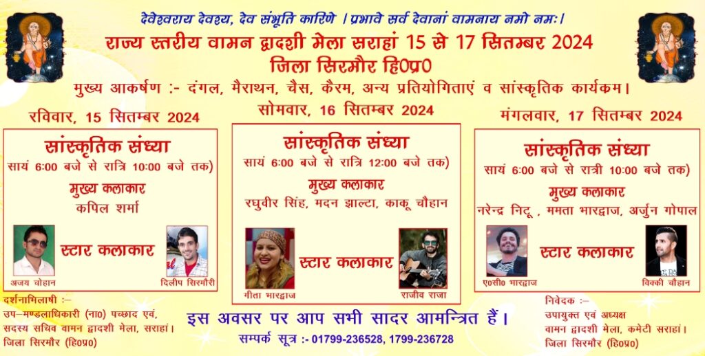 राज्यस्तरीय तीन दिवसीय सराहां वामन द्वादशी मेले में होने वाली सांस्कृतिक संध्याओं के लिए आज देर सांय मुख्य एवं स्टार कलाकारों के नाम मेला कमेटी ने फाइनल कर दिये हैं। मेला अधिकारी द्वारा जारी सूची में 13 गायक कलाकारों को जगह दी गई है।