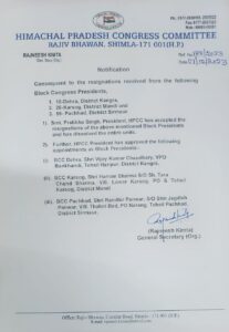 प्रदेश सरकार के 1 साल का कार्यकाल पूर्ण होने पर आयोजित होने वाले समारोह से ठीक पहले हिमाचल प्रदेश कांग्रेस कमेटी ने प्रदेश के तीन ब्लोकों में नियुक्त किये अध्यक्ष